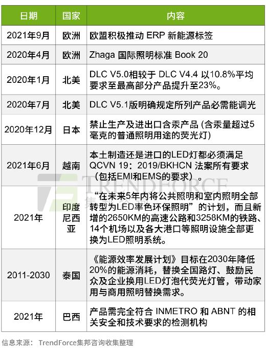 2003年英國政府通過《能源白皮書》鼓勵民眾使用LED照明,當地照明企業也積極參與研發、生產LED照明產品。2000~2006年歐洲推出“綠色照明計劃”,于是淘汰高耗能產品,歐盟到2009年9月起禁止使用大瓦數的白熾燈燈泡,并于2012年全面禁止白熾燈燈泡。而早在1997年,美國就以通過綠色照明項目實現節能70億千瓦時,后來該項目于1998年并入“能源之星”(Energy Star)建筑節能計劃中。