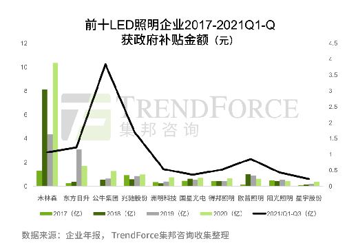 根據國家的產業計劃,技術的研發與突破成為政府鼓勵重點,特別是LED產業已逐步進入成熟階段。數據顯示,2021年前三季度,前37家LED A股上市企業獲得政府補貼,共計超13億元人民幣。其中,公牛集團在2021年前三季度獲得補貼最多達到8.34億元人民幣,同期凈利潤高達22.1億元人民幣。