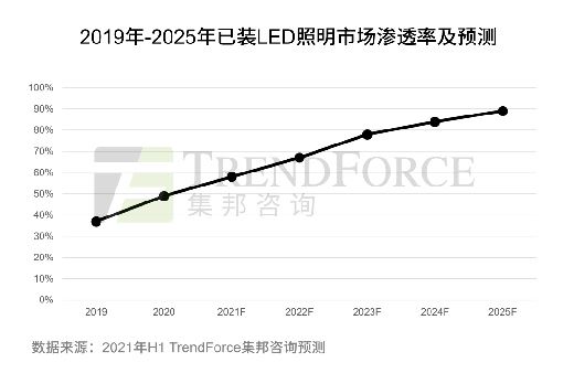 上游的產量暴漲,代表著下游的需求暴增。從燈具產品來看,2021年前三季度,中國照明產品出口總額為469.99億美元,同比增長達32.68%(中國照明電器協會),其中LED燈泡出口數量最多,達到45.49億件,出口金額也達到了33.86億美元。從市場滲透率來看,LED照明從2021年滲透率就接近60%,未來LED照明滲透率將持續增長。