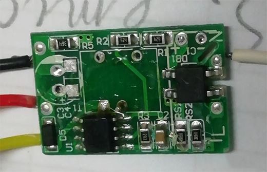 第三種是比較新的,電路比較復雜,電路中用到一個全橋整流,一個芯片控制的恒流驅動電路,還有電容濾波,發光二極管是采用兩個一組并聯,再33個串聯的方式,。電路采用表面安裝元件,雙面印刷電路,下面一張照片是我把電感線圈拆掉后看到的線路樣子,太不好看懂了,我也沒有畫出來。