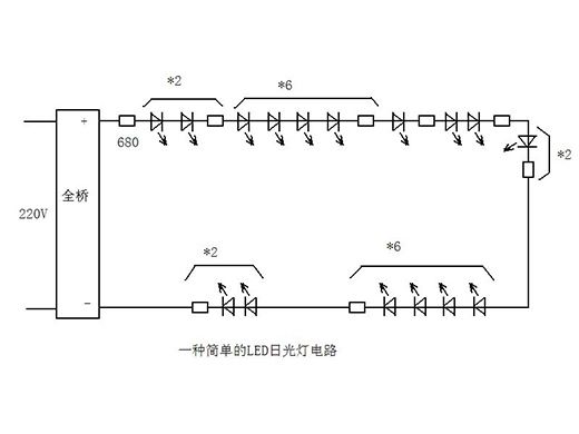 第二種是簡單的電路,采用橋式整流用了一個全橋,然后就是電阻限流,LED燈珠串聯的方式,這樣的電路不太好,就是沒有電容濾波,因此有頻閃,而且如果有一個燈珠開路損壞,就都不會亮了。上一種因為有兩只LED并聯,一只開路仍然能正常發光。