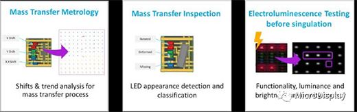 這允許回饋到磊晶制程本身,以改進(jìn)該制程品質(zhì),并向前回饋篩選出磊晶缺陷所導(dǎo)致的缺陷晶粒。其次,我們必須說(shuō)制造micro LED晶粒制程與傳統(tǒng)LED制程相比,需要使用相當(dāng)高的靈敏度水平上進(jìn)行缺陷檢測(cè),然后將這些檢測(cè)結(jié)果再次回饋到巨量轉(zhuǎn)移制程,以允許面板制造商僅使用已知的KGD(Known Good Die)組裝顯示器。