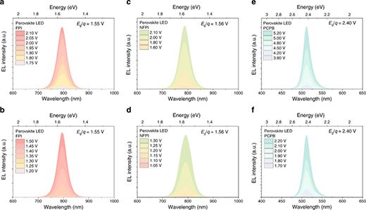 圖2. 鈣鈦礦LED在高于及低于帶隙所限制閾值電壓下的EL光譜