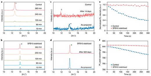 為了探索器件高穩(wěn)定性的原因,作者研究了雙極性分子SFB10對(duì)鈣鈦礦薄膜穩(wěn)定性的影響。結(jié)果表明,雙極性分子SFB10提高了鈣鈦礦薄膜的熱穩(wěn)定性、相穩(wěn)定性與熒光穩(wěn)定性。經(jīng)SFB10穩(wěn)定劑處理的鈣鈦礦樣品在空氣中放置322 天,仍然維持了具有良好光電活性的α相FAPbI3鈣鈦礦,而對(duì)照組樣品在14天內(nèi)就發(fā)生了相變與降解。