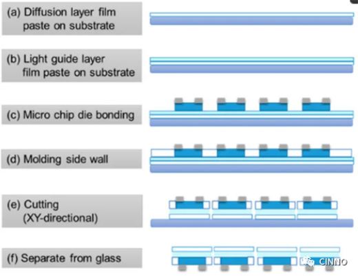 具體的封裝工藝大體上分六個(gè)步驟,包括基板上涂布擴(kuò)散層、基板上貼附導(dǎo)光膜、微芯片染料鍵合、側(cè)壁成型(Molding)、切割和與玻璃分離。