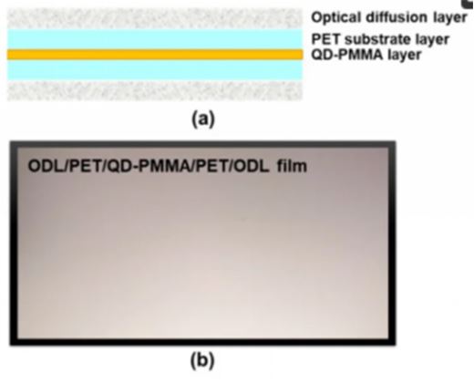 通過(guò)將市場(chǎng)上的紅色和綠色量子點(diǎn)與紫外線(xiàn)聚合物相結(jié)合,研究人員進(jìn)一步制作了一種混合量子點(diǎn)膜。接著,他們使用自動(dòng)刮刀涂布機(jī),將該混合量子點(diǎn)膜進(jìn)一步涂布在一層用作保護(hù)膜的PET薄膜上,最終形成了一種具有三明治狀結(jié)構(gòu)的量子點(diǎn)膜。之后,研究人員將這種具有PET/QD-PMMA/PET結(jié)構(gòu)的量子點(diǎn)薄暴露于365 nm紫外線(xiàn)下30秒以完成固化。為了制造出最終具有ODL/PET/QD-PMMA/PET/ODL結(jié)構(gòu)的成品膜,研究人員最后還需要使用刮刀涂布機(jī)將一種光學(xué)擴(kuò)散層 (ODL,Optical Diffusion Layer) 涂布到PET/QD-PMMA/PET 薄膜兩側(cè)。