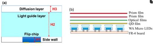 研究人員在一片用環(huán)氧樹(shù)脂和玻璃纖維(FR4)制成的電路板上排列鍵合了3200顆上述封裝好的廣角Mini-LED。整個(gè)背光單元中除了最底側(cè)的電路板(含Mini-LED),上方還有上述鈣鈦礦量子點(diǎn)膜和棱鏡等其他光學(xué)膜材。這些部品組合在一起后,就構(gòu)成了一片超薄、平坦且均勻的面光源。這里,光學(xué)膜一層一層地疊放在另一層上,它們之間的間隙很小。