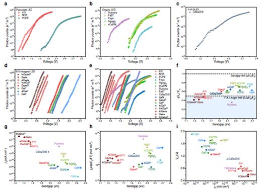在這項(xiàng)工作中測(cè)試了17種不同類(lèi)型的LED,首先選擇鈣鈦礦LED,制備了以近紅外發(fā)光的碘基材料FPI、NFPI以及綠色發(fā)光的溴基材料PCPB的鈣鈦礦LED,這三種LED的最低驅(qū)動(dòng)電壓分別是1.3V、1.3V及1.9V,LED中光子的最高能量分別為1.55eV、1.56eV及2.4eV。這表明三種材料的LED均可在低于帶隙所限制的最小閾值電壓下發(fā)光。接下來(lái)選擇幾種不同的OLED、QLED以及商業(yè)III–V族半導(dǎo)體LED,得到的結(jié)論與之前的相似。