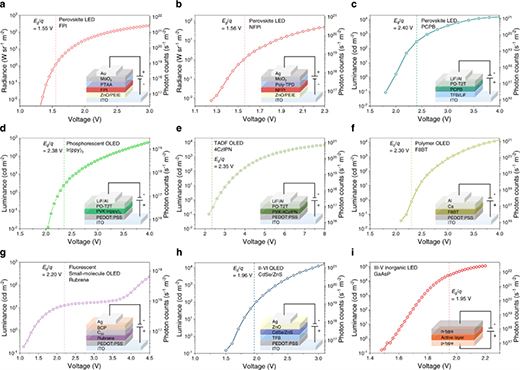 (a. 近紅外發(fā)射FAPBI3(FPI)鈣鈦礦LED;b.近紅外發(fā)射N(xiāo)FPI鈣鈦礦LED;c.綠光PCPB鈣鈦礦LED;d.基于Ir(ppy)3的磷光OLED;e.基于4CzlPN的TADF OLED;f.基于F8BT的聚合物OLED;g.基于紅熒烯的熒光小分子OLED;h.基于CdSe/ZnS QDs的II-VI QLED;i.基于 GaAsP 的商用 III-V 無(wú)機(jī) LED 。)