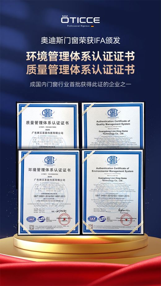 除此以外,奧迪斯門窗還歷經(jīng)多次科學(xué)、公正、嚴(yán)格的檢驗、審查及復(fù)核評審環(huán)節(jié),榮獲權(quán)威IFA認(rèn)證機(jī)構(gòu)頒發(fā)的環(huán)境管理體系認(rèn)證證書和質(zhì)量管理體系認(rèn)證證書,證明奧迪斯門窗在質(zhì)量管理和環(huán)境管理上達(dá)到國際水平,不僅有利于國內(nèi)市場發(fā)展,更有助于向全球市場拓展,讓中國質(zhì)造走向世界。