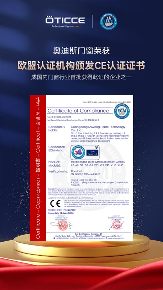 令人矚目的是,奧迪斯是首批獲得歐盟CE認(rèn)證的國內(nèi)門窗企業(yè)之一。在權(quán)威機(jī)構(gòu)的監(jiān)測之下,經(jīng)過安全、環(huán)保、衛(wèi)生等重重指標(biāo)測定,獲得了歐盟認(rèn)證機(jī)構(gòu)頒發(fā)的CE認(rèn)證證書,也就是取得了奧迪斯產(chǎn)品進(jìn)入歐洲的通行證。