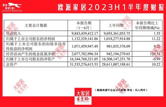 8月29日,歐派家居(SH603833)發(fā)布2023年半年度報告。2023上半年,歐派家居實現(xiàn)營業(yè)收入98.43億元,同比增長1.55%;實現(xiàn)歸屬于上市公司股東的凈利潤11.33億元,同比增長11.22%。