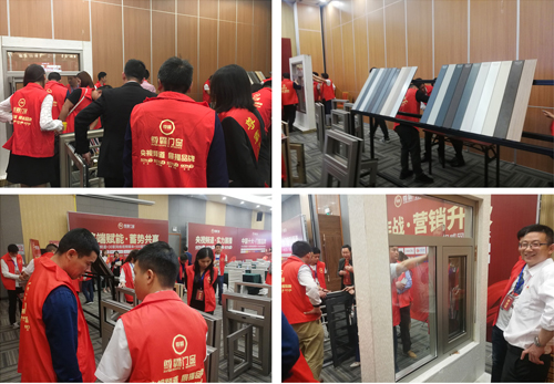 本次會議迎來了第一波高潮,那便是產(chǎn)品體驗環(huán)節(jié)。現(xiàn)場嘉賓紛紛離開座位,深入到產(chǎn)品展示區(qū),近距離觀摩尊霸門窗最新產(chǎn)品。經(jīng)銷商或拿出手機(jī)拍攝定格精美新品,或向現(xiàn)場工作人員詢問產(chǎn)品的相關(guān)細(xì)節(jié)資訊,或三三兩兩地圍在一起感嘆尊霸門窗新品之精美、之驚艷。