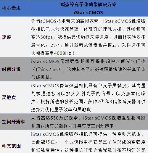 等離子體成像的核心要求,以及iStar sCMOS相機的功能總結如下: