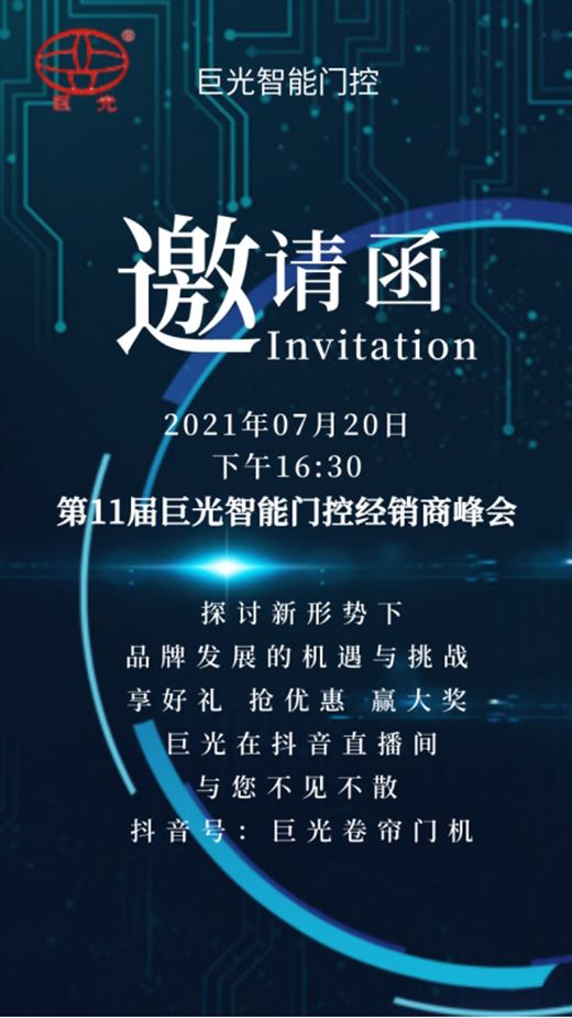 第11屆巨光智能門控經(jīng)銷商峰會(huì)將于2021年7月20日下午16:30隆重開啟。此次大會(huì)不僅以創(chuàng)新的線上抖音直播方式同步召開(抖音號(hào):巨光卷簾門機(jī)),還集結(jié)了2021上半年逆勢(shì)增長(zhǎng)之路、下半年品牌發(fā)展探索、新品體驗(yàn)、百萬經(jīng)銷商經(jīng)驗(yàn)分享等多項(xiàng)重磅內(nèi)容,更有百萬豪禮贈(zèng)送給直播間觀看的客商們,備受行業(yè)專家、廣大消費(fèi)者及各大媒體的關(guān)注。巨光門控,在此誠(chéng)邀您共同見證開啟第11屆巨光智能門控經(jīng)銷商峰會(huì)新篇章!