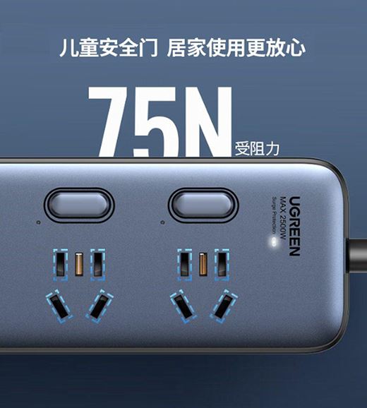 全部插孔內都配有兒童安全門,在遭遇異物單邊插入時,保護門會鎖死,不會暴露出內部金屬器件,從而杜絕觸電危險,守護家庭用電安全。