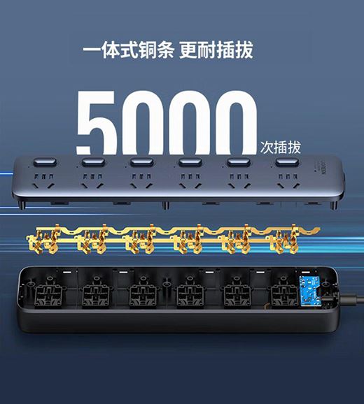 綠聯防雷延長線插座內部采用一體銅條設計,相比起舊式多個單獨插套焊接,一體銅條擁有更穩固的結構,整體性更強,導熱性能更好,耐 5000 次插拔不易松動。