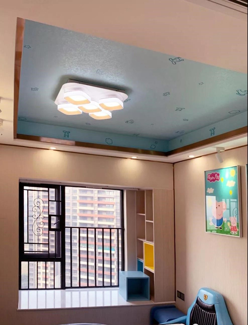 兒童房,用彈涂澗石藍(lán)做天花凹凸感加卡通圖案布藝給人可愛溫馨的感覺,簡潔的布局營造一派熱鬧的田園美景中弱化了繁雜的感覺,沿海一帶濕氣重,用上貝殼粉涂料可以達(dá)到防霉防潮的效果,減少小朋友因氣候多變所引發(fā)的感冒、發(fā)燒、過敏等問題。