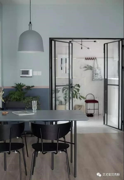 餐廳的墻面上平涂青出于藍(lán)色、閃藍(lán)色,旁邊放一些綠色的植物顯得和諧又溫暖,再搭配簡約的吊燈,顯得不累贅而又時(shí)尚。