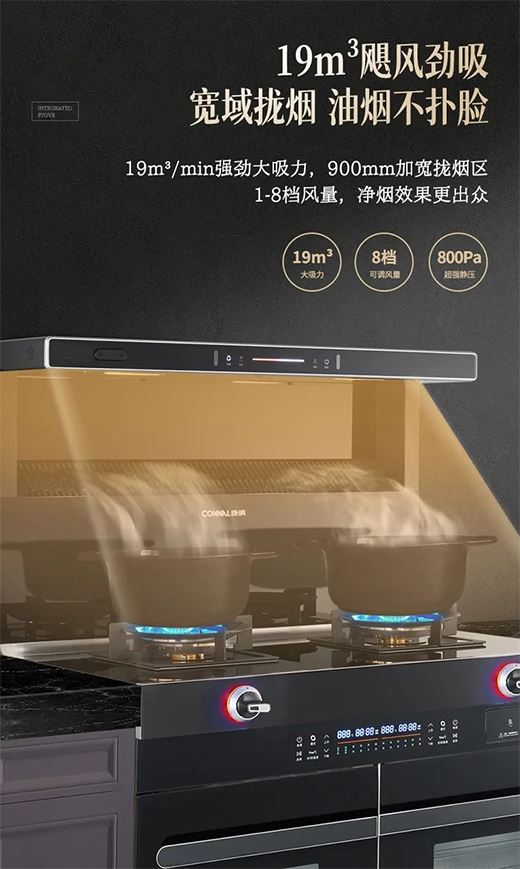 夏季的封閉式廚房熱的像烤爐,多通風,才能把堆積的熱能盡快排出。康納大吸力變頻集成灶,采用一體式集成設計,能夠有效節省廚房空間,一臺可抵N臺家電。