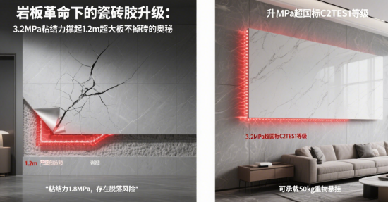粘結(jié)力是衡量瓷磚膠性能的重要指標(biāo)之一。在巖板安裝過程中,足夠的粘結(jié)力能夠確保巖板與基層之間牢固結(jié)合,防止巖板出現(xiàn)空鼓、脫落等問題。傳統(tǒng)瓷磚膠的粘結(jié)力一般在1-2MPa之間,對于小尺寸瓷磚的粘貼能夠滿足要求,但對于1.2m超大板巖板來說,這樣的粘結(jié)力遠(yuǎn)遠(yuǎn)不夠。