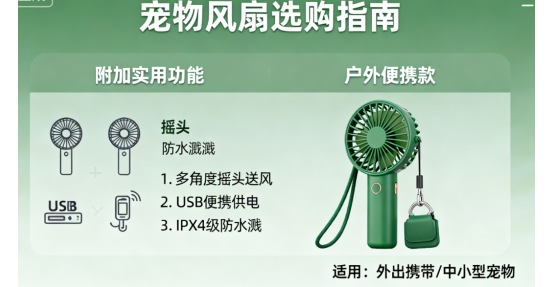 寵物環(huán)境的清潔維護至關重要。優(yōu)先選擇可拆卸式風罩(無需工具即可拆卸清洗),避免毛發(fā)長期堆積滋生細菌。水箱式風扇需注意水箱材質是否為食品級304不銹鋼,防止水質二次污染。對戶外養(yǎng)寵家庭,建議選擇續(xù)航≥8小時的充電款,電池容量應≥20000mAh,支持TypeC快充協(xié)議。