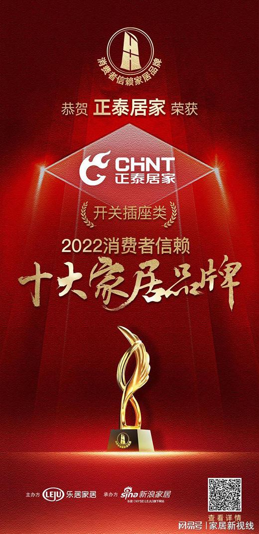 2022年11月1日,歷時52天,歷經網絡票選、專業評審的「2022消費者信賴十大家居品牌」開關插座榜單正式揭曉。其中,正泰居家榮登「2022消費者信賴十大家居品牌」開關插座榜單!