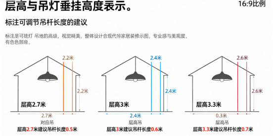 層高2.73.0米:垂掛距離建議4060cm(吊燈底部離地1.92.2米),避免碰頭且保證照明覆蓋;