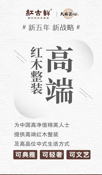紅古軒對品牌25年發(fā)展歷程進(jìn)行深刻總結(jié),調(diào)整品牌戰(zhàn)略規(guī)劃,全新提出三個“高端”定位,致力于為客戶創(chuàng)造高品位、高附加值的產(chǎn)品服務(wù),成為高品位中式家居生活的提供者。