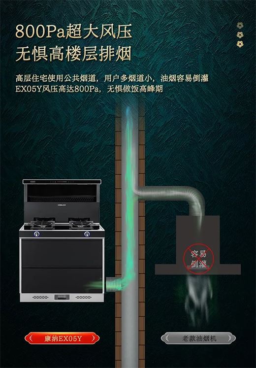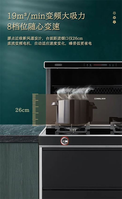 在創(chuàng)新升級(jí)方面,康納全新一代變頻消毒集成灶采用直流變頻電機(jī),搭配高速智能芯片,800Pa超大風(fēng)壓,釋放強(qiáng)勁動(dòng)力,輕松應(yīng)對(duì)油煙問(wèn)題,再也不會(huì)出現(xiàn)“做飯高峰期油煙倒灌”現(xiàn)象。