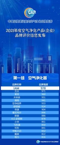 中國品牌價值評價榜單由新華社、中國品牌建設促進會、中國資產評估協會等單位主辦。自2013年首次開展以來,如今已經覆蓋一二三產業及涵蓋部分區域品牌。中國品牌建設促進會一直遵循品牌評價國際標準和國家標準,堅持“科學、公正、公開、公認”工作原則,連續9年的公益性品牌價值評價工作越來越得到社會各界的關注和認可。而IAM連續3年登頂年度空凈品牌評價第1,展示了IAM強勁的品牌實力,持續領跑空凈行業!