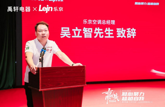 樂京空調事業部總經理吳立智發表致辭。他提及,作為禹軒電器的合作品牌,樂京將始終站在代理商身后,提供高品質、高性價比、制冷效果好的空調產品和堅持整機六年全國聯保、1年質量問題包換的服務保障,為禹軒電器在廣州市場的開拓提供最有力、最及時的支持和幫助,讓每一位經銷商都能放心大膽地開拓市場,實現自我超越。