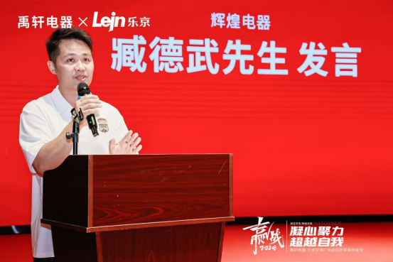 客戶代表輝煌電器-臧德武發表感言。他表示,感謝樂京空調-禹軒電器團隊的支持和信任,空調銷售旺季馬上來臨,在樂京空調品牌和禹軒電器的帶領下,我們定能大干一場,完成業績指標,超越既定目標,取得更好的業績。
