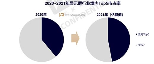 據《2021微間距LED顯示屏調研白皮書》估算,頭部屏廠與中小型屏廠的比較優勢差距逐漸顯現,2021年境內TOP5企業市占率預估可近市場總量的一半。