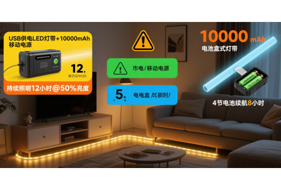 -移動電源:移動電源是一種方便攜帶和使用的備用電源。您可以將LED燈帶連接到移動電源上,在停電時隨時為燈帶供電。確保移動電源的電量充足,并定期進行充電。