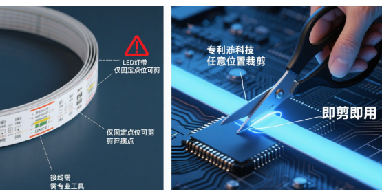 傳統的LED燈帶在裁剪和接線方面存在著諸多不便。一般來說,普通LED燈帶只能按照固定的間隔進行裁剪,這是因為其內部電路是按照特定的模式設計的,如果隨意裁剪,很可能會導致燈帶損壞,無法正常發光。而且,在接線過程中,需要專業的工具和技能,對于普通用戶來說,操作難度較大。此外,傳統接線方式容易出現接觸不良的問題,影響燈帶的使用壽命和發光效果。這些問題不僅限制了LED燈帶的使用范圍,也降低了用戶的使用體驗。