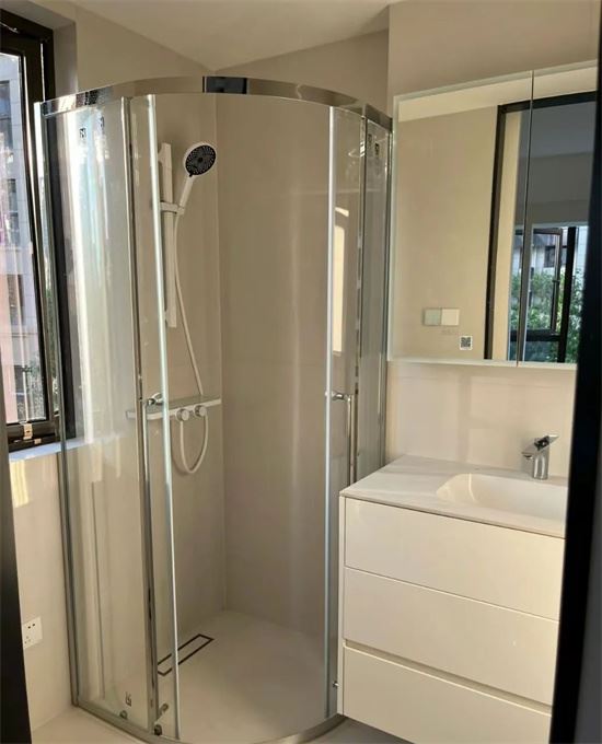 扇形的玻璃門可選用兩邊移開的開門方式,能節省過道空間,也避免磕碰到旁邊的馬桶或柜子。