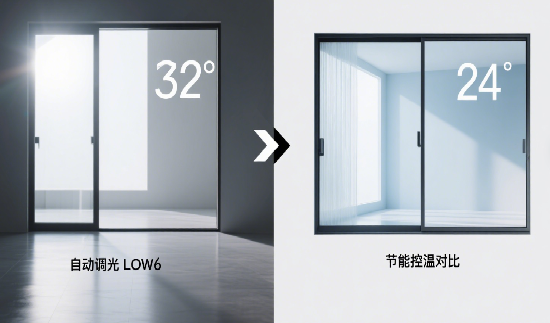 Low-E玻璃本身就具有良好的隔熱性能,能有效阻擋太陽輻射熱進入室內,減少空調等制冷設備的能耗。而自動調光功能則在此基礎上更進一步,它可以根據室外光線強度和室內溫度自動調節玻璃的透光率,在保證室內采光的同時,最大程度地降低能源消耗。