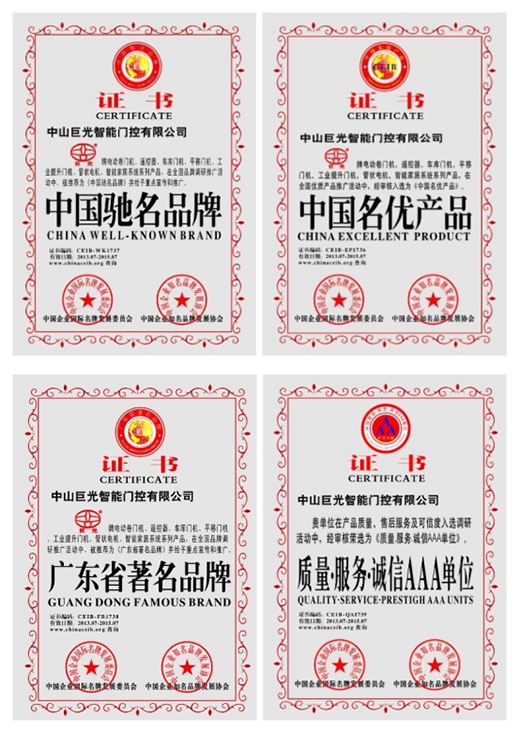 從中國制造到中國創造,從行業品牌到民族品牌,巨光門控不斷探索品牌成長新路徑,順利拿下“中國馳名品牌”、“中國名優產品”、“廣東省著名品牌”、“質量-服務-誠信-AAA單位”等榮譽獎項,引領一眾門控品牌共同成長。