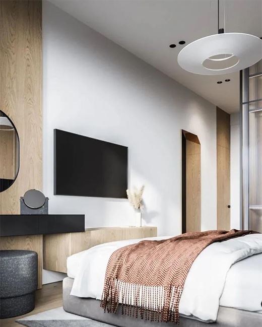 天然木飾面墻板是目前應用較多的,木飾面防墻板也是必不可少,臥室空間的墻面用天然木飾面是個不錯的選擇。