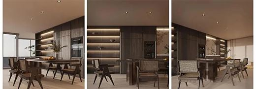 一字鋪開的櫥柜系統,一面到頂的設計,加以木飾面與鏡面的材質碰撞,串聯起精致、簡約而豐盈的空間秩序。
