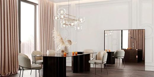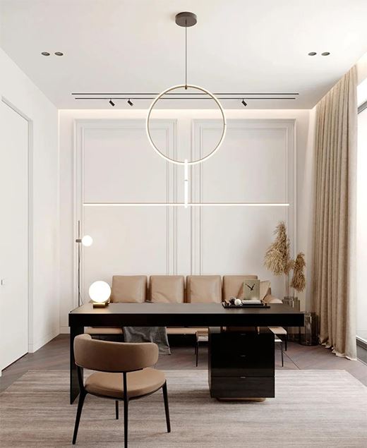 餐廳在簡約柔美的空間中,木飾面與巖板有機結合,疊加石膏線和燈泡吊燈,讓孩子能夠在舒適的就餐環境中享受美味。