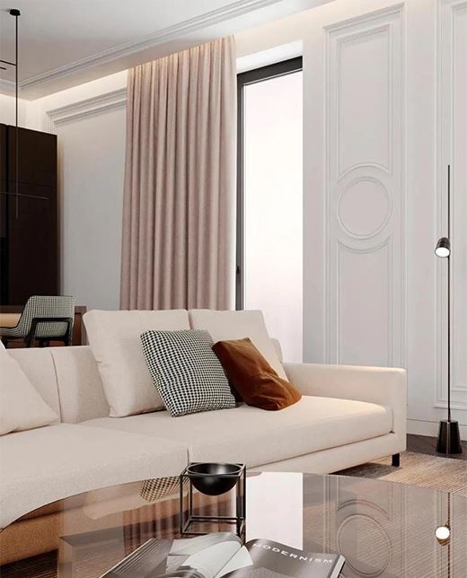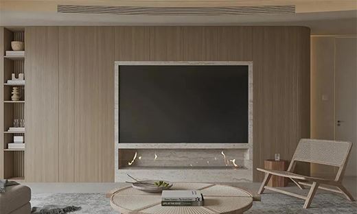 寬敞的客廳空間,展現出整體而凝練的簡致美,定制的煙熏柚木電視背景墻,垂直紋理自然優美,氣質深沉,帶來極致舒適的視感體驗。