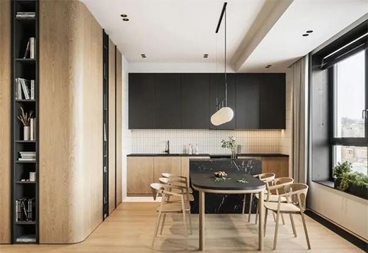 開放式的布局光線充足,搭配素雅的窗簾,豐富的木紋,為生活和空間帶來舒適。