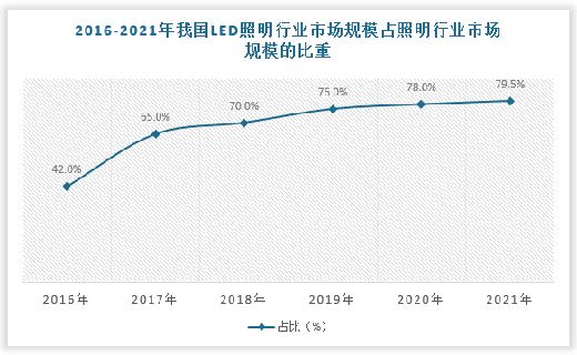 LED照明即發(fā)光二極管照明,是一種半導(dǎo)體固體發(fā)光器件。目前LED照明應(yīng)用廣泛,產(chǎn)業(yè)滲透率持續(xù)提升。數(shù)據(jù)顯示,2016-2021年,我國(guó)LED照明行業(yè)市場(chǎng)規(guī)模占照明市場(chǎng)規(guī)模的比重由42%增長(zhǎng)至79.5%。