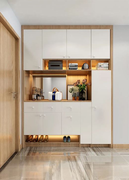 高大全鋁玄關柜能有序收納回家的隨手物品與常穿鞋履,同時還能懸掛外套,加上穿衣鏡之后完美變身入戶衣帽間。
