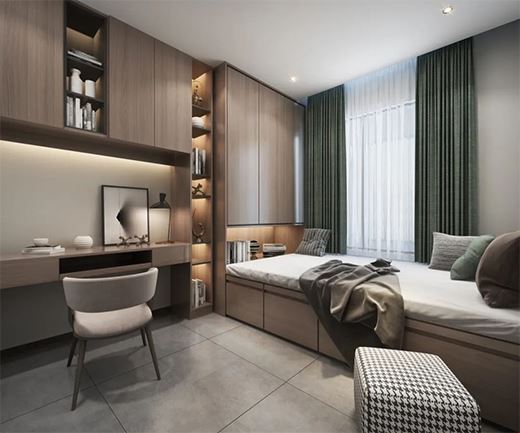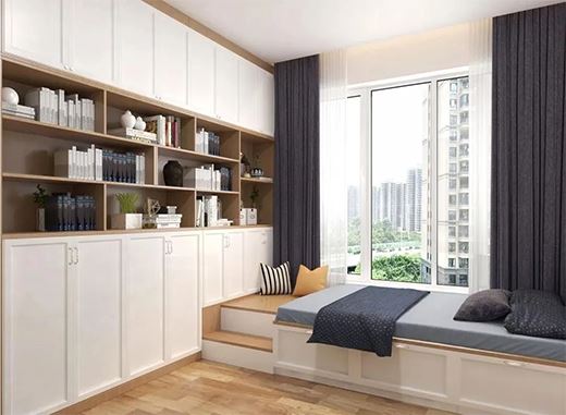靠窗安裝榻榻米+衣柜/儲物柜+書桌的布局方式,可以在不影響采光的前提下,更好地完成衣物、書籍和零碎物品的收納,還能提高整體空間的使用率,營造簡潔干凈的空間感。