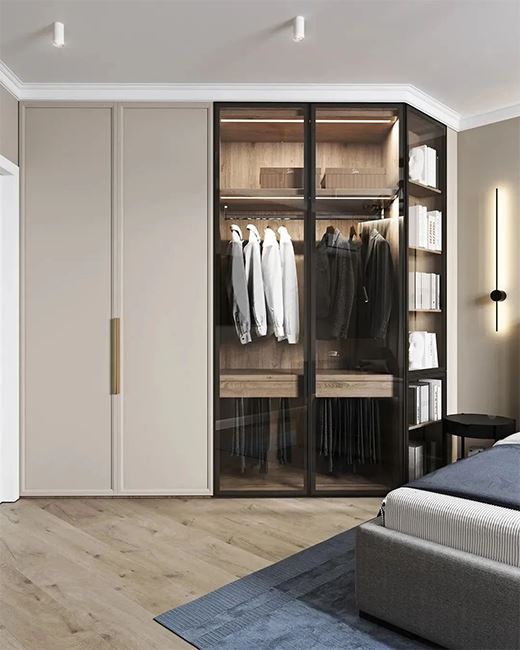中小戶型的臥室想要儲存大量的衣物,可利用的空間又很有限,然而定制轉角到頂衣柜就能充分利用這個空間,提高使用率。轉角全鋁衣柜擁有很強的收納功能,同時在小空間也能不顯擁擠,美美的衣服可以各種任性買回家,還能讓臥室大放異彩。