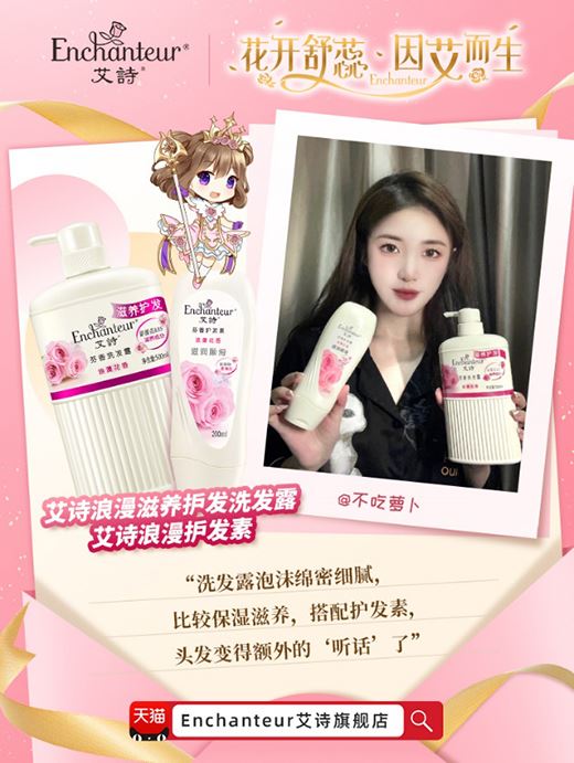 艾詩浪漫花香洗發護發套裝,包含艾詩浪漫滋養護發洗發露和艾詩浪漫護發素。艾詩浪漫滋養護發洗發露特含薔薇花B5成分,保濕滋養,養護發絲。玫瑰精華深入滋養發根,及時補充養分,減少頭發分叉,讓秀發柔軟順滑易梳理,潤澤柔滑。搭配富含對發絲友好的氨基酸和玫瑰精華的浪漫護發素使用,發絲柔滑潤澤程度加倍持久。淡淡的玫瑰花香縈繞在發絲上,留香明顯,存香持久。