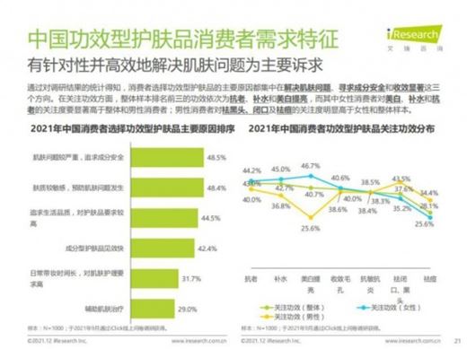 根據(jù)艾瑞咨詢《2021年中國(guó)功效型護(hù)膚品行業(yè)研究報(bào)告》,調(diào)研結(jié)果的統(tǒng)計(jì)得知,消費(fèi)者選擇功效型護(hù)膚品的主要原因集中在解決肌膚問(wèn)題、尋求成分安全和功效顯著這三個(gè)方向。在功效方面,抗老成為消費(fèi)者的最主要訴求。